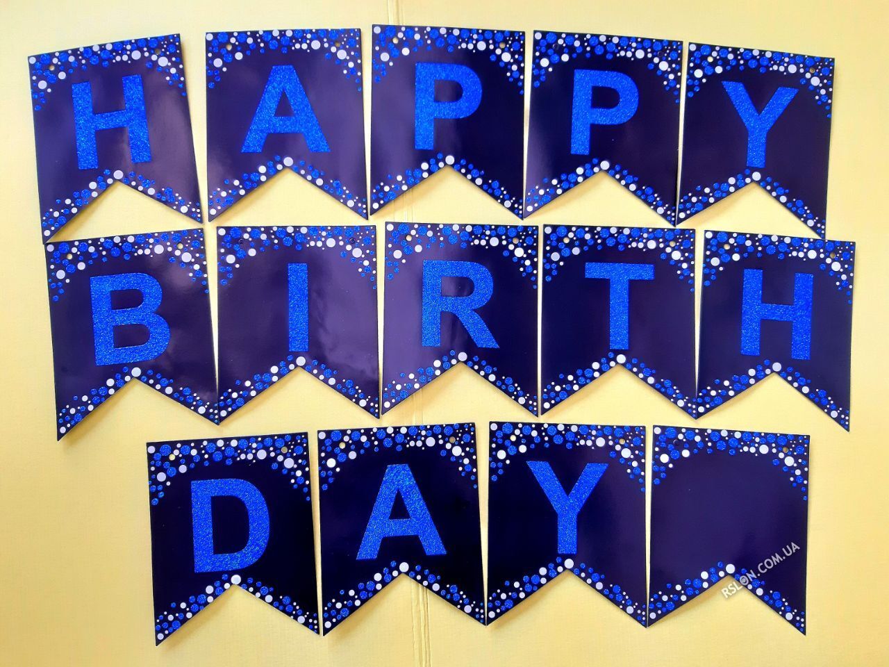 Баннер гірлянда "Happy Birthday" Сині на чорном. Довжина: 5м.