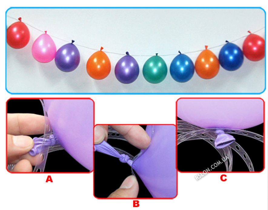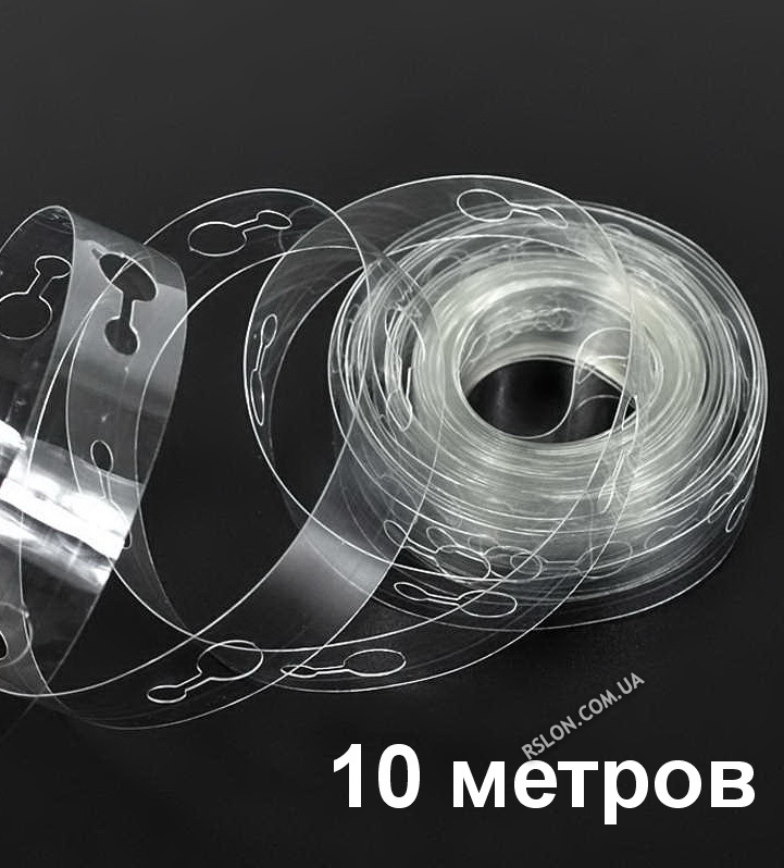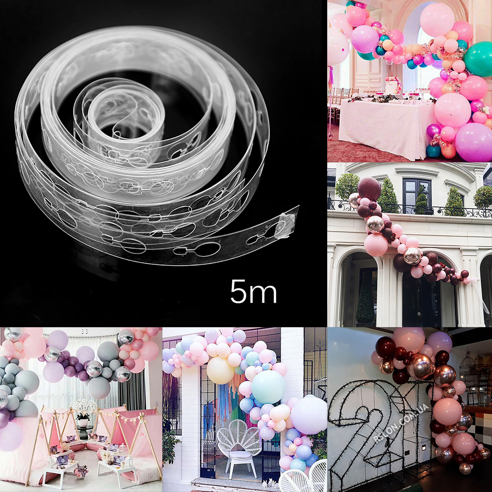 Соединительная лента для крепления воздушных шаров различных размеров предназначена для изготовления арки из шаров. Длина ленты 10 метров, ширина 1 см, расстояние между отверстиями 2,5 см. Лента мягкая, не заламывается при изгибе, прозрачная.